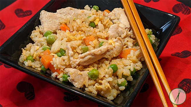 מחממים שמן בווק או במחבת גדולה, מטגנים שום וג'ינג'ר כחצי דקה ומוסיפים את העוף. מטגנים עד להזהבה קלה ומוציאים לצלחת. באותה המחבת מטגנים את האורז כדקה עד שהוא מתחמם ומשמיע קולות פצפוץ. מוסיפים את הביצים הטרופות ומטגנים תוך כדי ערבוב מתמיד עד שהביצה נעשית היטב ומשתלבת באופן אחיד באורז.