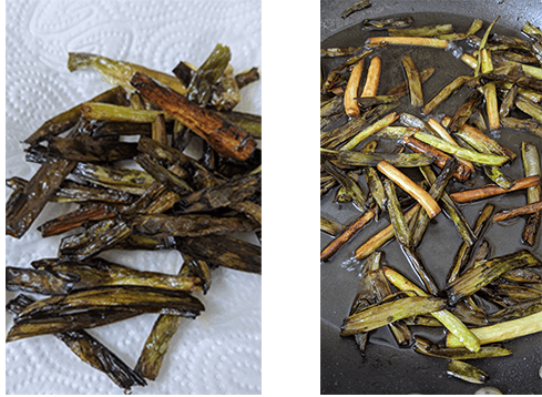 מחממים שמן במחבת על אש בינונית ומטגנים את הבצל עד להשחמה עמוקה (כמעט שרוף), זה לוקח בערך 20 דקות. מוציאים כמחצית מהחלקים הירוקים של הבצל לצלחת מרופדת בנייר סופג.