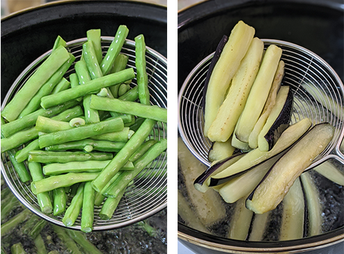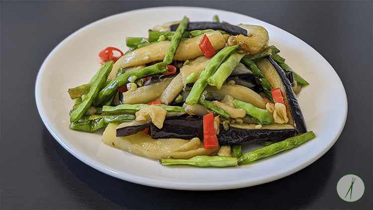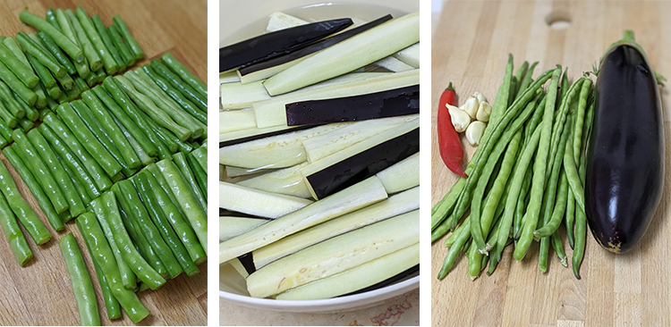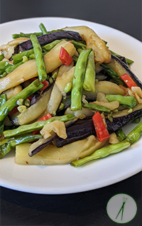 במקור משתמשים במתכון הזה בחצילים אסייתיים צרים, ארוכים וסגולים ובזן של לובייה ארוכה (snake bean, בעברית היא נקראת שעועית תאילנדית). כשנתקלתי בסופר בלובייה טרייה אז כמובן שרכשתי צרור ורצתי להכין את המנה הזו שלמרות שהיא מטוגנת היא לא מכבידה בכלל. במקום החצילים האסייתיים השתמשתי בחציל הכי צר וארוך שמצאתי.