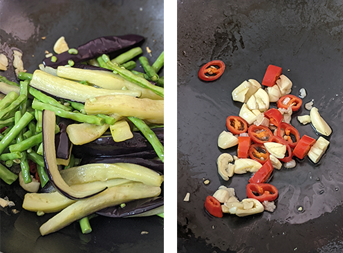 בווק או במחבת מחממים שתי כפות שמן (אפשר להשתמש בשמן החם שטיגנו בו את הירקות) ומטגנים מעט את השום והצ'ילי, מוסיפים את החצילים והלובייה ומטגנים יחד כ-2 דקות.