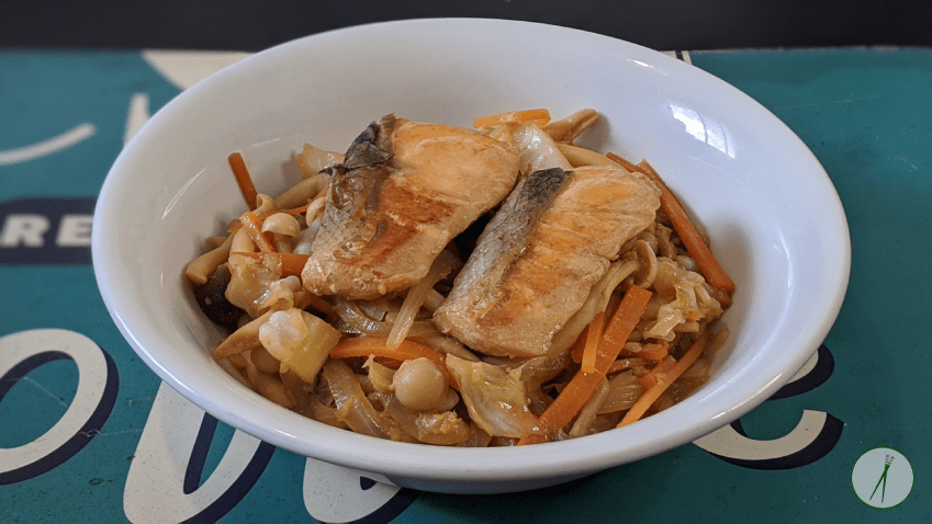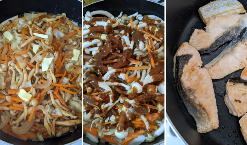 כשהעור כלפי מטה. כשהסלמון זהוב הופכים את הפרוסות ומפזרים עליהן את הירקות ומעל את הרוטב. סוגרים את המכסה ומנמיכים את האש לבינונית, מאדים כ-10 דקות. פותחים את המכסה ומערבבים את הירקות עם הרוטב, משתדלים לא לפגוע בפרוסות הדג. סוגרים את המכסה וממשיכים לבשל עוד 10-15 דקות עד שהירקות רכים.