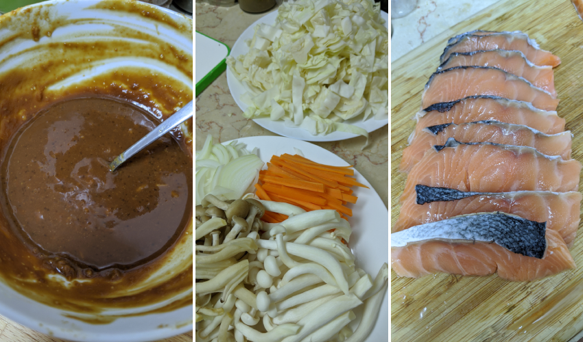 פורסים את הסלמון לפרוסות אלכסוניות לרוחבו בעובי 3 ס"מ, מערבבים עם מלח וסאקה ומניחים בצד.