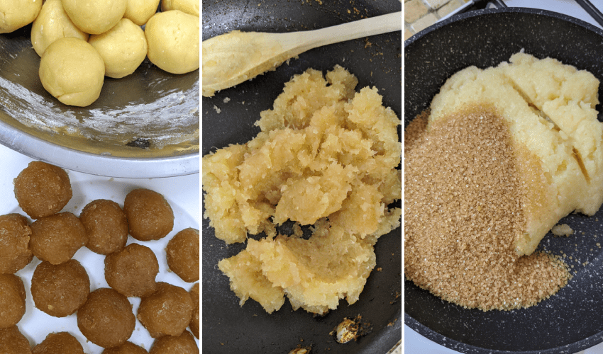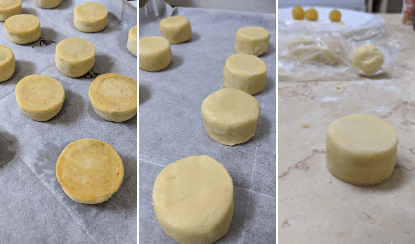 משטחים כדור בצק על כף היד, מניחים במרכזו כדור אננס ועוטפים אותו עם הבצק מכל הכיוונים. בעזרת פלטה/מרית/קלף יוצרים מהכדור שנוצר צורה של דיסקית עגולה עם שתי פאות ישרות, מניחים בתבנית מרופדת בנייר אפייה וחוזרים על הפעולה עם שאר כדורי הבצק והאננס (אם באיזשהו שלב הבצק נהיה רך מידי מכניסים אותו למקרר לצינון של כמה דקות).