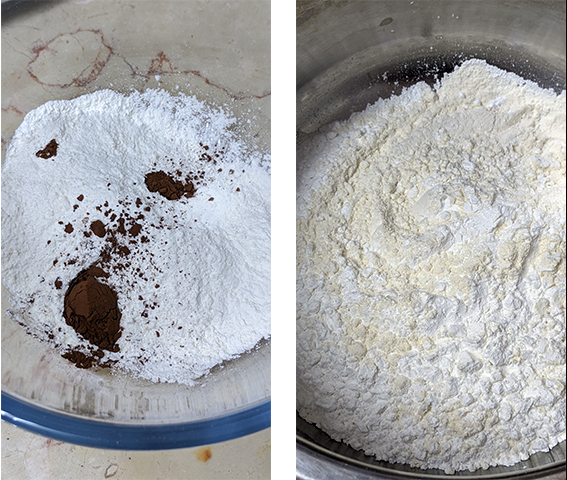 מערבבים את הקמחים ומחלקים לשתי קערות, אחת עם 70 גר' והשנייה עם 100 גר'. לקערה עם ה-70 גר' מוסיפים קקאו ומערבבים היטב.