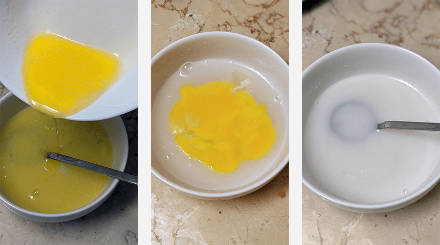בקערה נפרדת שמים חלב קוקוס עם סוכר וקורט מלח ומערבבים עד שהסוכר נמס, אפשר לחמם 30 שניות במיקרוגל כדי לעזור לסוכר להתמוסס יותר מהר. מוסיפים חלמון, חמאה מומסת ומיץ לימון ומערבבים היטב.