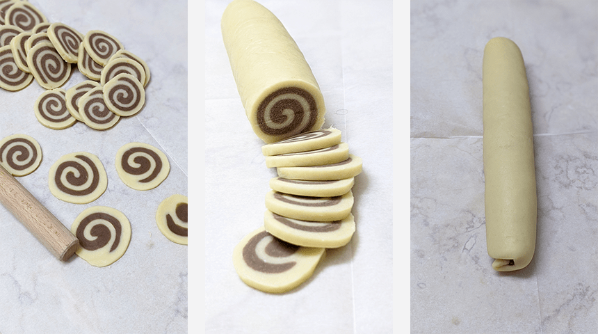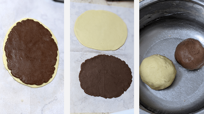 מרדדים את הבצק הלבן למלבן בעובי חצי ס"מ. מרדדים את הבצק החום למלבן בגודל זהה לבצק הלבן. בעזרת מברשת אפייה מושכים מעט מים על הבצק הלבן ומניחים עליו את הבצק החום בצורה חופפת. מהדקים מעט עם הידיים ומגלגלים את שני הבצקים יחד לקבלת גליל שמנמן, עוטפים את הגליל בניילון נצמד ומכניסים למקרר לשעתיים.
