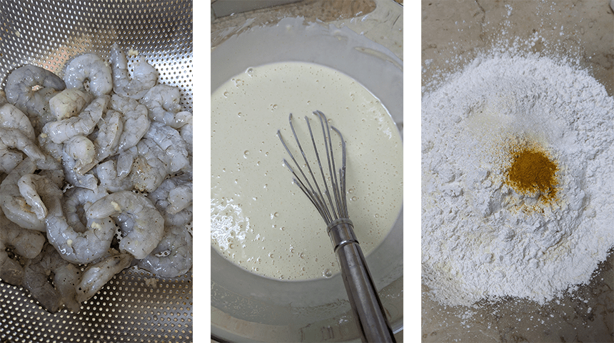 מערבבים את הקמחים עם סוכר, מלח, כורכום ואבקת אפייה. מוסיפים את המים ומערבבים בעזרת מטרפה לתערובת דלילה ואחידה ללא גושים ומניחים בצד ל-30 דקות.