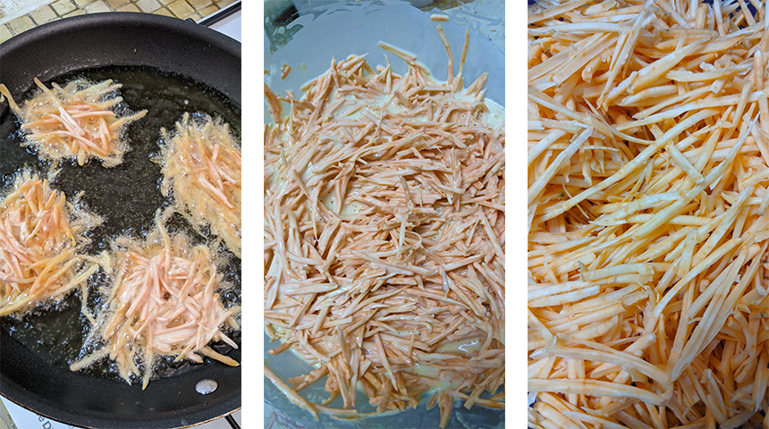 חותכים את הבטטה לגפרורים דקים, אפשר בעזרת פומפיית ג'וליאנים ואפשר גם לגרר על פומפייה רגילה בעלת חורים גדולים.