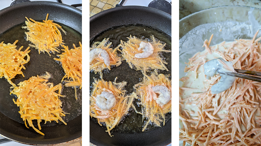 מחממים שמן במחבת על חום בינוני. מניחים כף מתערובת הבטטה בשמן החם ומשטחים לדיסקית עגולה עם גומה במרכזה (כמו קן של ציפור), לוקחים שרימפס אחד, טובלים בנוזל הבלילה של הבטטות ומניחים בגומה שבמרכז הלביבה. כאשר החלק התחתון של הלביבות שחום מעט הופכים אותן בזהירות כדי שהשרימפס לא יפול. מטגנים עד להשחמה ומוציאים לצלחת מרופדת בנייר סופג, מכינים באותו האופן את שאר הלביבות.