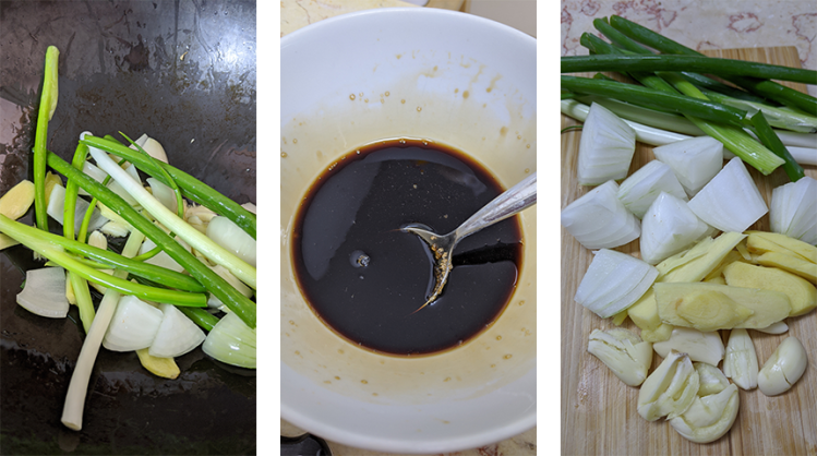 חותכים את הבצל לקוביות גדולות ואת הבצל הירוק ל-3-4 חלקים, מקלפים את הג'ינג'ר ופורסים לפרוסות, מקלפים את שיני השום ומועכים מעט.