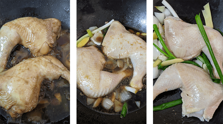 מחממים מעט שמן בווק או במחבת עמוקה ומטגנים בצל, בצל ירוק, ג'ינג'ר ושום כדקה. מוסיפים את העוף ומטגנים 2-3 דקות מכל צד עד להזהבה קלה.