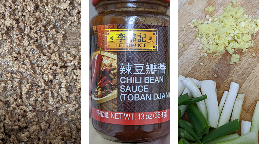 מחממים 2 כפות שמן בווק על אש גבוהה. מוסיפים את הבשר הטחון, מטגנים עד להשחמה יפה ומוציאים לצלחת. מוסיפים לווק את 2 כפות השמן הנותרות ואת הדו-באן-ג'יאן ומטגנים חצי דקה. מוסיפים שום, ג'ינג'ר ואבקת צ'ילי ומטגנים כדקה.