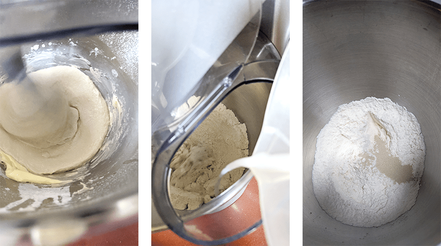 בקערת מיקסר מערבבים קמח עם מלח וסוכר, מוסיפים שמרים ומערבבים. מוסיפים את המים והחלב ומפעילים את המיקסר על מהירות בינונית. כשנוצר בצק מוסיפים את החמאה וממשיכים ללוש עוד 8-10 דקות.