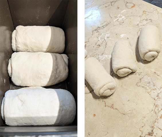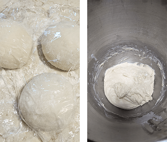 מוציאים את הבצק לקערה משומנת (הבצק מאוד דביק ולכן מומלץ לשמן את הידיים לפני שנוגעים בו) מכסים את הקערה בניילון נצמד ומתפיחים 30-40 דקות עד שהוא מכפיל את נפחו. לאחר ההתפחה מוציאים את הבצק למשטח מקומח היטב, מחלקים לשלושה כדורים שווים בגודלם מכסים בניילון נצמד ומתפיחים 30 דקות נוספות.