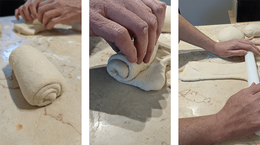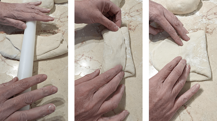 מרדדים כל כדור למלבן בעובי ½ ס"מ, מקפלים את צידו הצר של המלבן כלפי המרכז ואת הצד שני מעל הצד הראשון. מסובבים את המלבן כך שצידו הצר מולנו וקו התפר פונה הצידה, מרדדים לאורכו לעובי ½ ס"מ.