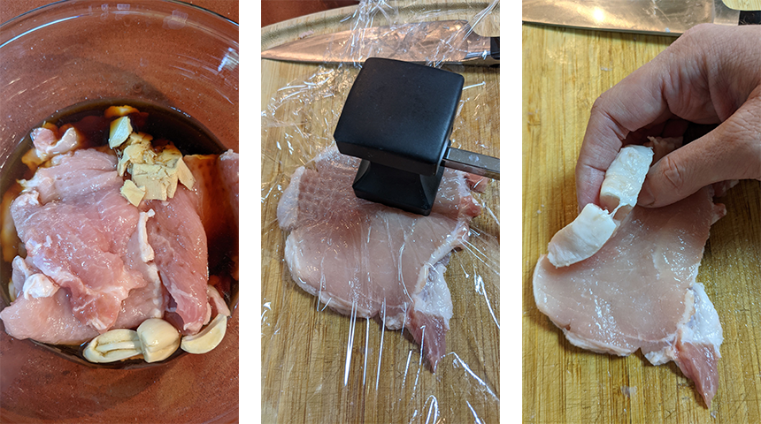 מכינים את הצלעות להשרייה: מסירים את העצם וחורצים את הקרום שמסביב בכמה מקומות, מה שימנע מהצלעות להתכווץ בזמן הטיגון.