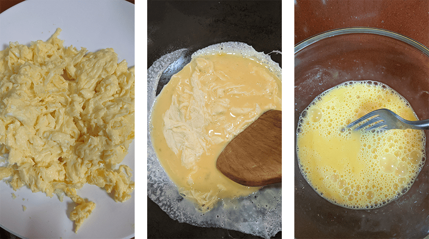מכינים את האורז. מחממים בווק שתי כפות שמן על חום בינוני גבוה. מוסיפים את הביצים הטרופות ומטגנים תוך כדי ערבוב עדין עד שנוצרת מקושקשת בהירה, מוציאים לצלחת ומניחים בצד.