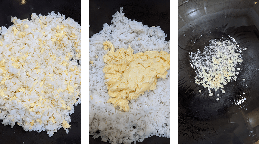 מוסיפים 2 כפות שמן לווק, מטגנים מעט את השום הכתוש ומוסיפים את האורז המבושל, מתבלים במלח ופלפל לבן ומערבבים כדקה. מחזירים את הביצה ומערבבים יחד עד שהביצה מפוזרת באופן אחיד באורז. מכבים את האש ומניחים בצד.
