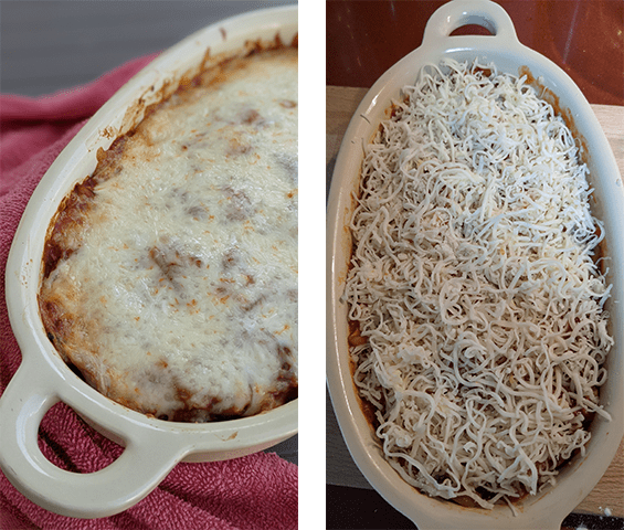 מפזרים בנדיבות את המוצרלה המגוררת, מכניסים את התבנית לתנור ואופים 20-30 דקות עד שהמאפה שחום והגבינה מבעבעת. מגישים מיד.