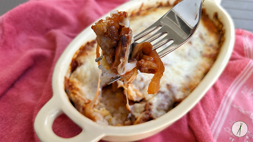 מחממים תנור ל-180 מעלות ובינתיים מרכיבים את המאפה. בתבנית חסינת חום מניחים את האורז בשכבה אחידה ומהדקים. מסדרים את הבשר על האורז ויוצקים מעל את הרוטב באופן שווה.