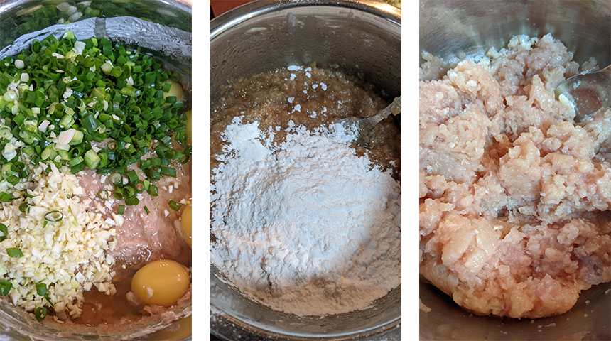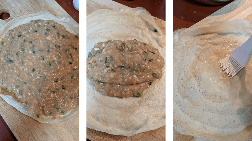 מכינים את המילוי. בקערה גדולה שמים את העוף הטחון, מוסיפים את שאר מרכיבי המילוי ומערבבים נמרצות לכיוון אחד במשך כ-5 דקות לקבלת תערובת דלילה (יחסית), אחידה ומעט דביקה. מכסים בניילון נצמד, מניחים במקרר לחצי שעה לספיגת טעמים ובינתיים מכינים את מעטפת החביתה.