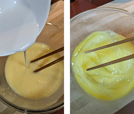 טורפים את הביצים, בקערית נפרדת ממיסים קמח טפיוקה במים ומערבבים עם הביצים הטרופות. שומרים בצד 2 כפות מתערובת הביצים לשימוש בהמשך.