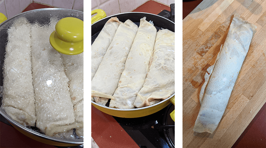 שמים מים בסיר אידוי או בסיר רגיל שיכול להכיל את הצלחת עם הרולים, אם משתמשים בסיר הרגיל מניחים הגבהה בתוך הסיר ומוזגים מים עד שהם מגיעים קצת מתחת לגובה ההגבהה. מניחים בתוך הסיר את הצלחת עם הרולים, סוגרים את המכסה ושמים את הסיר על אש גבוהה. מאדים 20 דקות לאחר הרתיחה.