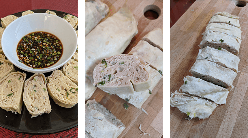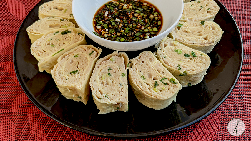 עלי חביתה דקיקים ממולאים בבשר, מאודים ופרוסים לפרוסות. מאכל סיני ביתי שאפשר אפילו למצוא משומר (ma ling egg roll) נאכל בדרך כלל לארוחת בוקר או כנשנוש. המילוי המסורתי לחביתה הוא חזיר, אני הכנתי את גרסת העוף.