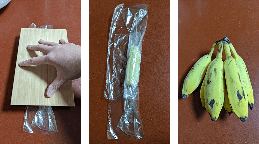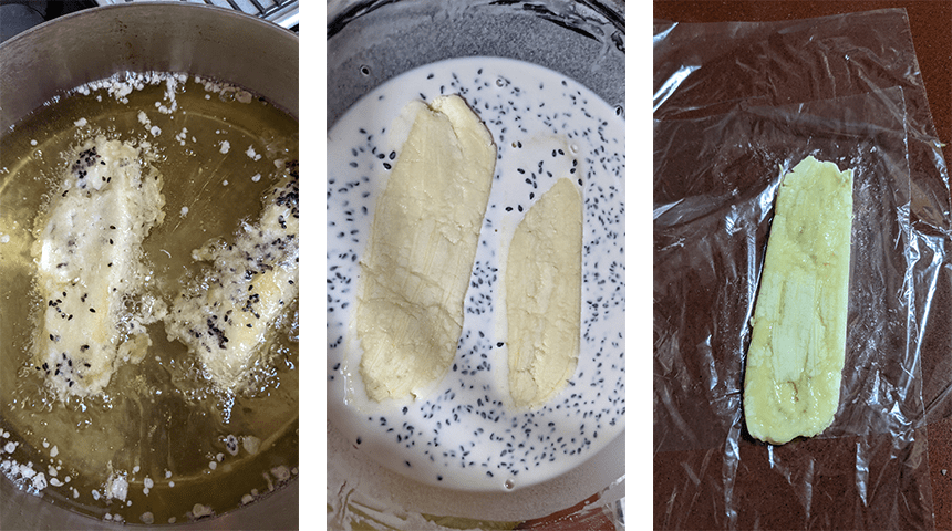את הבננות רצוי להכין אחת אחת בסמוך לטיגון כדי למנוע התפרקות שלהן. מערבבים את תערובת הקמחים והמים לאחר המנוחה כדי לאחד אותה שוב. במחבת רחבה מחממים שמן לטיגון עמוק. מקלפים את הבננות, מניחים בננה אחת על שקית ניילון עבה ומגלגלים את הבננה עם השקית. מועכים את הבננה בעזרת חפץ רחב ושטוח (קרש חיתוך קטן לדוגמה) לעובי אחיד של 3-4 מ"מ.