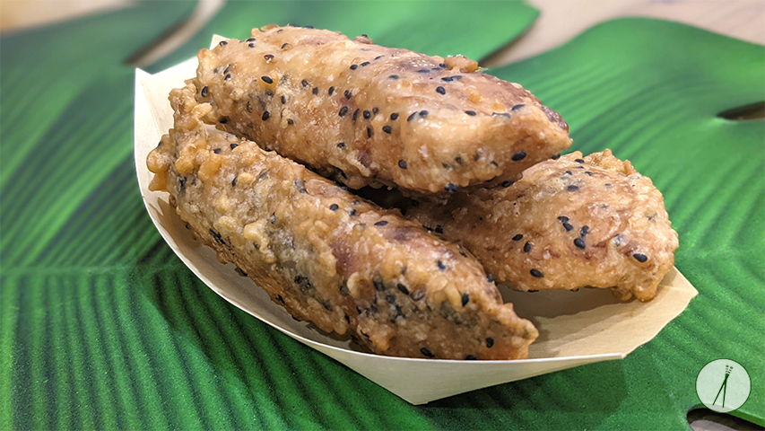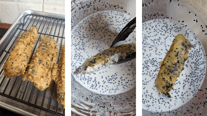 בננות מזן סאבא (או סבא, סבה) מטוגנות בבלילה פריכה בעלת מתיקות מעודנת. אוכל רחוב ויאטנמי קלאסי המוכר גם במדינות אחרות במזרח אסיה בגירסאות מעט שונות זו מזו. בננות סאבא הן קצרות ועבות יותר מהבננות המוכרות לנו, טעמן חמצמץ מעט ומרקמן יותר עמילני בדומה לפלנטיין. ניסיתי להכין את המתכון עם בננות רגילות, אך המרקם שלהן רך מידי ונוטה להתפרק בזמן הטבילה בבלילה ולדעתי טעמן חזק מידי לסוג זה של קינוח. את הבננות מועכים לפני הטיגון כשהן מגולגלות בתוך שקית ניילון עבה על מנת לשמור על צורה מוארכת. טבילת הבננות בתערובת הציפוי והטיגון שלהן נעשה פעמיים בשביל אקסטרה פריכות, אני ממליצה לעבוד עם מלקחיים, מה שמקל על העברת הבננות מהשמן לתערובת הציפוי ובחזרה.