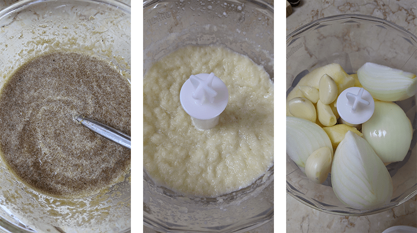 מכינים את המרינדה. מקלפים תפוח ואגס נאשי, מגלענים, חותכים גס ושמים במעבד מזון. תפקיד האגס במרינדה בנוסף לתוספת טעם ומתיקות הוא לרכך את הבשר בזכות אנזימים שקיימים בו. מקלפים בצל, ג'ינג'ר ושום, חותכים גס ומוסיפים למעבד המזון. טוחנים הכל יחד לתערובת חלקה.