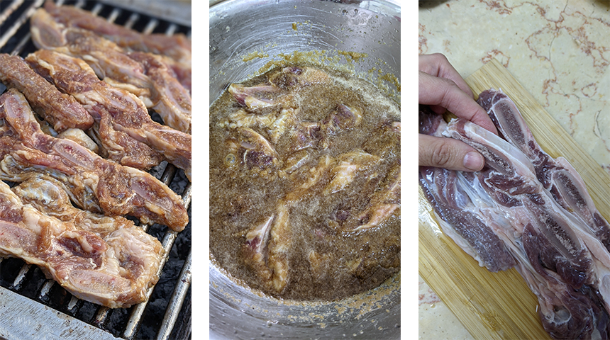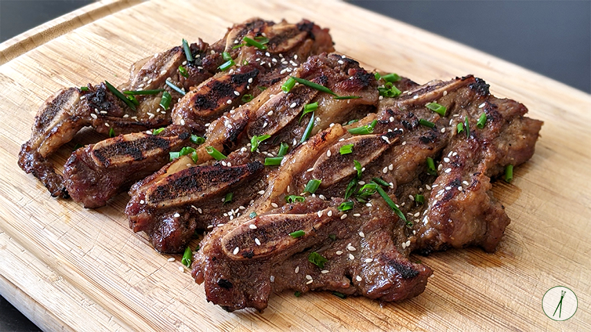 שורט ריב (פרוס דק עם העצמות) מושרה במרינדה קוריאנית מתקתקה וצלוי על הגריל או על מחבת.