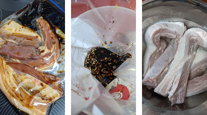 בייקון סיני (בקנטונזית Lap yuk). רצועות של בטן חזיר מושרות בסויה ויין בישול סיני, מיובשות בתנור. הבייקון משמש כסוג של תיבול ותוספת טעם למנות שונות כגון אורז וירקות מוקפצים. בדרך כלל מייבשים את רצועות הבייקון כשהן תלויות בחוץ במשך כשבוע אך אני השתמשתי בתנור הביתי כשהוא במצב טורבו על חום נמוך וייבשתי במשך יומיים. התוצאה – בייקון עם טעם מרוכז ומלוח עם ארומה מיוחדת האופיינית למטבח הסיני.