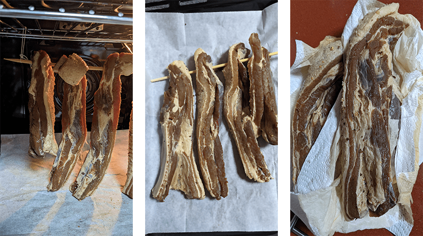 מייבשים את הבשר בתנור כיומיים (תלוי בעובי הבשר) עד שהבשר מתקשה אך השומן נשאר מעט רך.