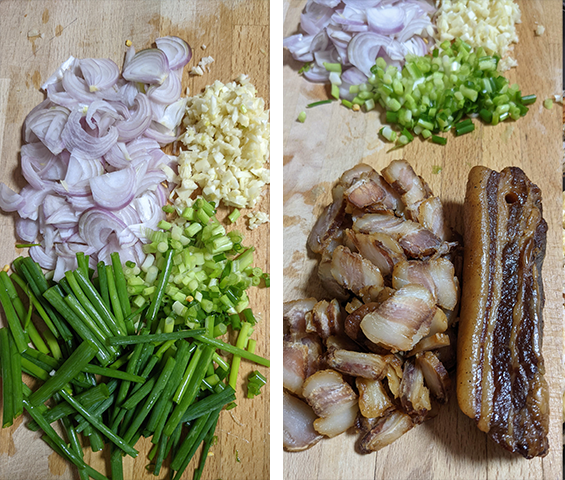 Lap yuk chao fan – אורז מוקפץ זריז העושה שימוש בבייקון סיני. בזמן הטיגון השומן של הבייקון נמס מה שמעניק לאורז ארומה מיוחדת ומעשיר את המנה. אפשר להשתמש בירקות נוספים כגון כרוב, נבטים, תירס או גזר.