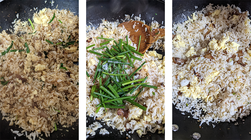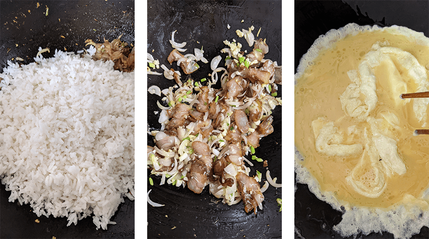 מחממים ווק על אש גבוהה, מוסיפים רבע כוס שמן ומסובבים את הווק כך שהשמן יכסה את כל שטחו. מחממים עד שהשמן מעלה עשן, מסירים את הווק מהאש ושופכים את השמן. מוסיפים 2 כפות שמן קר ומחזירים את הווק לאש. שופכים את הביצים הטרופות לווק ומטגנים תוך כדי ערבוב עד לקבלת מקושקשת רכה ומוציאים לצלחת. מוסיפים 2 כפות שמן לווק ומטגנים את פרוסות הבייקון, שאלוט, שום, ג'ינג'ר והחלקים הלבנים הקצוצים של הבצל עד שהם מתחילים להזהיב. מוסיפים את האורז ומערבבים היטב. מטגנים כ-5 דקות עד שהאורז יבש, משמיע קולות פצפוץ והגרגירים מופרדים "אחד אחד".
