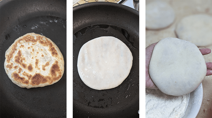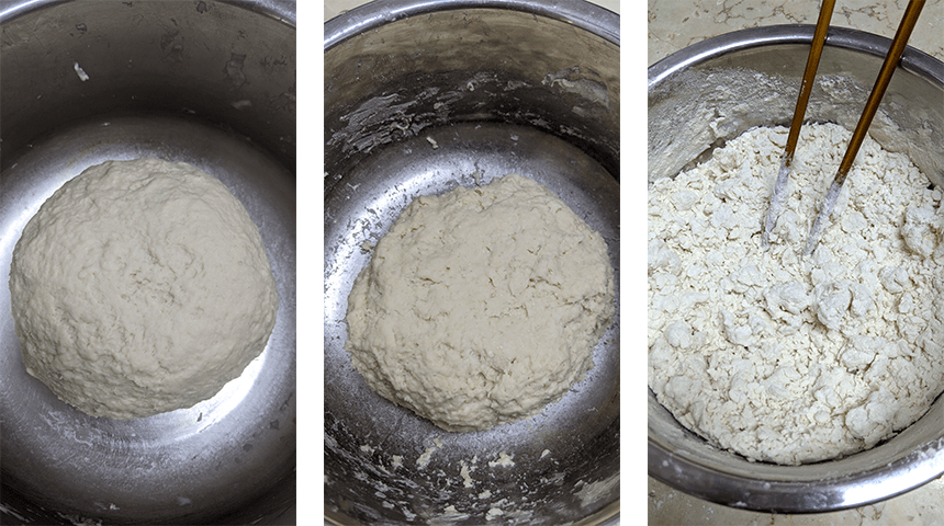 מכינים את הבצק – בקערה גדולה שמים קמח, מוסיפים מים רותחים ומערבבים בעזרת כף עץ. מוסיפים מלח ומים חמים ולשים לקבלת בצק דביק, מכסים בניילון נצמד ומניחים בצד ל-30 דק'. לאחר המנוחה מוסיפים 2 כפות שמן ולשים לאיחוד, מניחים בצד למנוחה של שעתיים לפחות.
