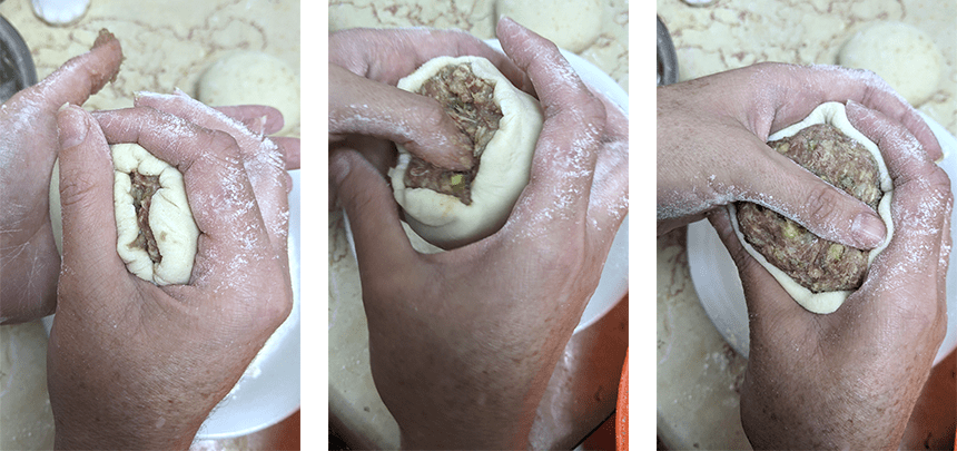 מחלקים את הבצק ואת המילוי ל-10 כדורים שווים בגודלם, מקמחים מעט את כדורי הבשר על מנת שלא ידבקו לידיים. פוחסים מעט עיגול בצק בין כפות הידיים ומניחים במרכזו כדור בשר.