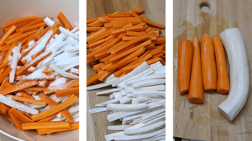 חותכים דייקון וגזר לרצועות באורך כ-6 ס"מ ובעובי מקסימלי של ½ ס"מ. מעבירים לקערה ומפזרים כף מלח, מערבבים היטב ומשרים כחצי שעה עד שהירקות מגירים נוזלים ומתרככים. שוטפים היטב תחת זרם מים קרים ומסננים.