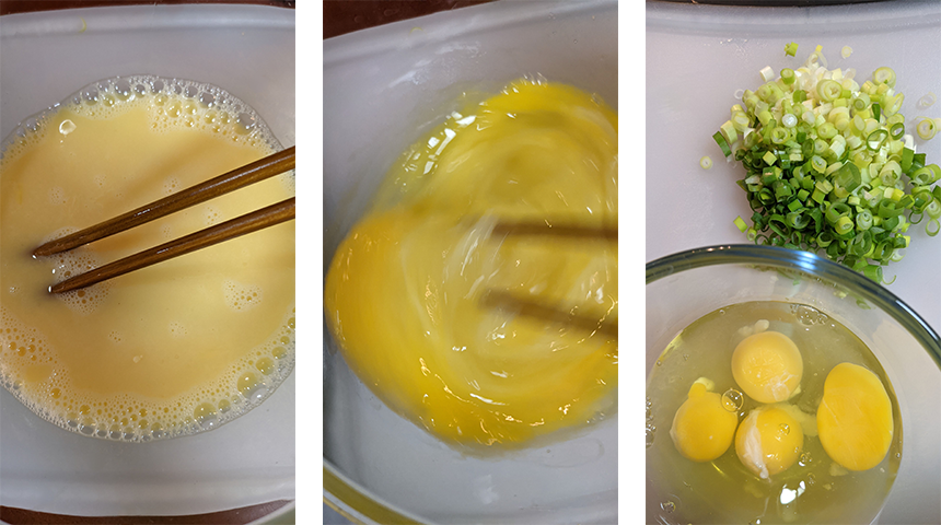 כאשר רוב תערובת הביצים מתגבשת אך עדיין מאוד רכה מפסיקים לערבב ומפזרים מעל מחצית מהבצל הירוק הקצוץ, מכסים עם מכסה ומבשלים 3 דקות. מכבים את האש, מסירים את המכסה ומפזרים מעל את שארית הבצל הירוק הקצוץ, שמן שומשום ושומשום קלוי.
