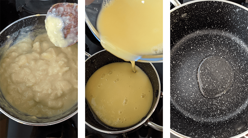 מחממים כף שמן בסיר אישי קטן על אש נמוכה. מוסיפים את הביצים הטרופות ומבשלים תוך כדי ערבוב מתמיד.
