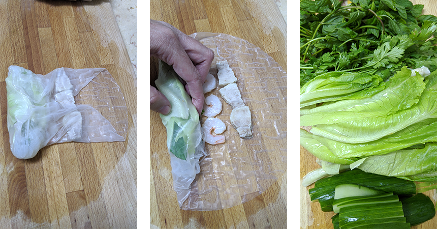 מרכיבים את הרולים – טובלים דף אורז במים חמימים ומניחים על משטח עבודה. בשליש דף האורז הקרוב אלינו מסדרים את החסה, עלי עשבי התיבול ומעט מהאטריות. במרכז דף האורז ליד הירקות מניחים 3 חצאי שרימפס כשהצד החתוך כלפי מעלה. בחלק העליון של דף האורז, צמוד לשרימפס, מסדרים 3 פרוסות בשר. משאירים 5 ס"מ רווח עד לקצה דף האורז.