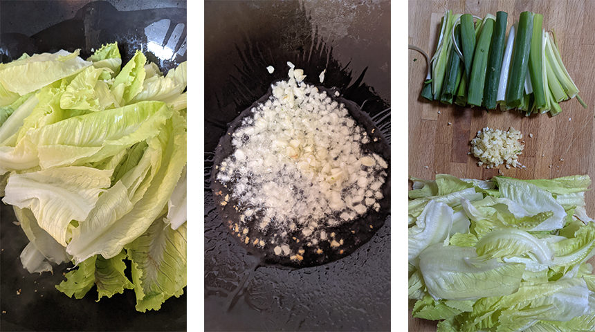 מחממים שמן בווק על להבה גבוהה, מוסיפים את השום ומטגנים כחצי דקה (בזהירות לא לשרוף), מוסיפים את עלי החסה ומטגנים כדקה תוך כדי ערבוב.