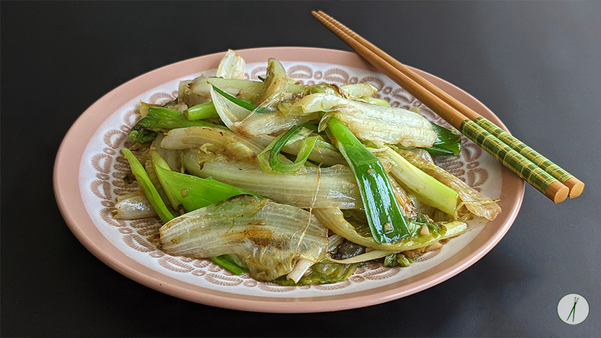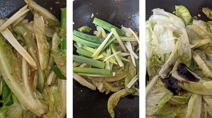 כשהחסה מאבדת מעט מהנפח שלה אך עדיין פריכה מוסיפים רוטב צדפות, מלח וסוכר, מערבבים כחצי דקה ומוסיפים את הבצל הירוק. מערבבים חצי דקה נוספת עד שהבצל מתרכך מעט.