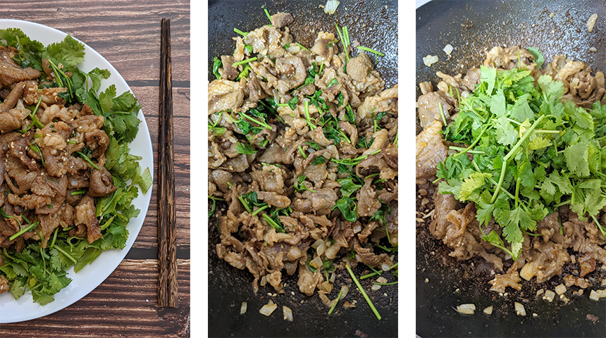 מתבלים בסוכר, מלח, כמון, אבקת צ'ילי, שמן צ'ילי, וגרעיני שומשום ומקפיצים חצי דקה. מוסיפים כוסברה ושמן שומשום, מקפיצים עוד כמה שניות ומוציאים לצלחת הגשה.