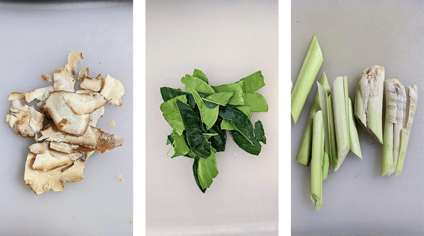 מתחילים בהכנת המרכיבים – מסירים את החלקים הירוקים העציים מהלמון גראס ומועכים מעט (אפשר בעזרת פטיש שניצלים), חותכים באלכסון למקטעים באורך 5 ס"מ. מועכים את שיני השום ומסירים את הקליפה. קורעים את עלי הקפיר ליים לשניים או שלושה חלקים ומסירים את הגבעול שבמרכז העלה. מועכים מעט את הצ'ילי ואת פרוסות הגאלאנגאל.