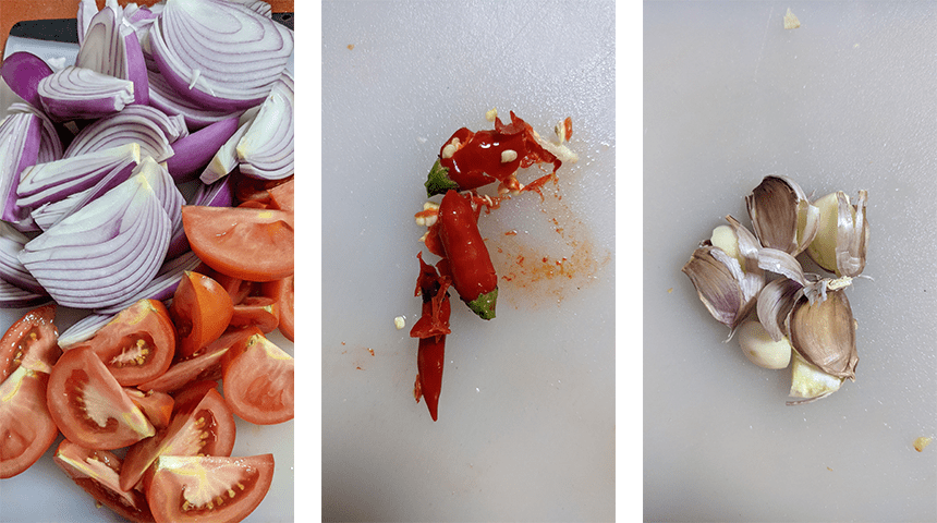 חותכים את העגבניות והבצלים לפלחים ואת הפטריות חותכים לחצאים או לרבעים תלוי בגודל. אם משתמשים בעוף או בדג חותכים אותם לקוביות גדולות.