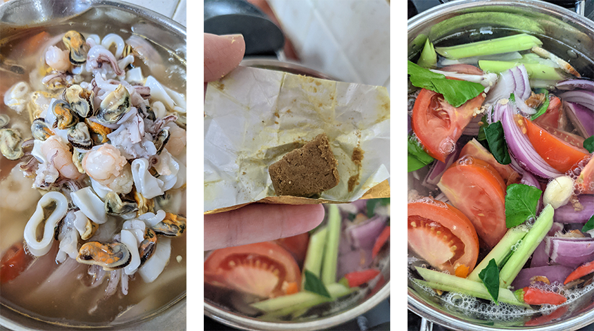 מכינים את המרק – בסיר גדול שמים מים ומביאים לרתיחה. מוסיפים עגבניות, בצל, למון גראס, גאלאנגאל, צ'ילי, שום, קפיר ליים, ואבקת מרק עוף. מרתיחים ומבשלים כ-5 דקות כדי שכל הטעמים ישתחררו לתוך המים, בשלב הזה הבית יריח כמו תאילנד 😄.