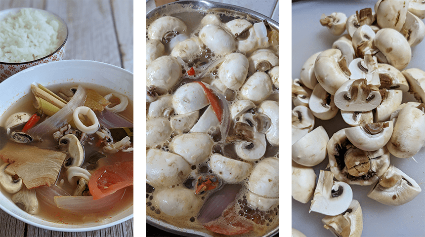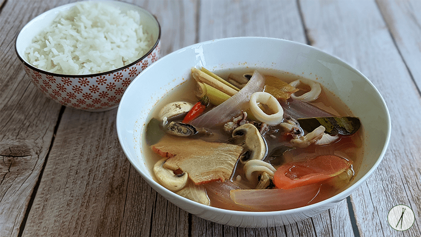 מרק טום יאם תאילנדי – tom yum. מרק קלאסי בטעמים עזים של חמוץ וחריף. נקרתה בדרכי ההזדמנות לבשל את המרק המופלא הזה עם שי חזן שגר מספר שנים בתאילנד והוא אלוף בבישול אוכל תאילנדי אותנטי (תבדקו גם את ערוץ היוטיוב שלו, יש לו שם הרבה סרטונים מפורטים למתכונים תאילנדים). המרק הזה מאוד פשוט להכנה, אך ישנם כמה דגשים שכדאי לשים אליהם לב – המרק הזה הוא הבסיס ואליו אפשר לצרף עוף, פירות ים או דגים, בכל מקרה צריך לשים לב לא לבשל יותר מדי. אם משתמשים בעוף – אפשר להשתמש בחזה עוף או פרגיות אבל כדאי להשתמש בחתיכות עם עצם כמו כנפיים, שוקיים או גרונות ואפשר גם לשים חלקי פנים כמו לבבות וכבדים. אם משתמשים בדג – רצוי להשתמש בדג לבן כמו ברמונדי, אפשר גם סלמון. את הלמון גראס והגאלאנגאל כדאי למעוך מעט עם מכתש ועלי (פטיש שניצלים יעשה עבודה טובה במקרה הזה). אם אין לכם עלי קפיר ליים טריים אפשר להשתמש בעלים של לימון או של חושחש, חפשו את העלים הבוגרים. לסוג הצ'ילי ישנה חשיבות רבה ומומלץ להשתמש בצ'ילי תאילנדי קטן שבתרגום חופשי נקרא "קקי של עכבר" ובשם יותר מעודן נקרא "עין של ציפור" (bird's eye). את הפטריות מוסיפים ממש לקראת הסוף כדי שלא יתרככו מידי. מי שלא אוהב רוטב דגים יכול להחליף במלח. אם לא רוצים להוסיף אבקת מרק אפשר להחליף את המים בציר כלשהו. העגבנייה לא חובה אך היא מוסיפה טעם וחמיצות נהדרת למרק.