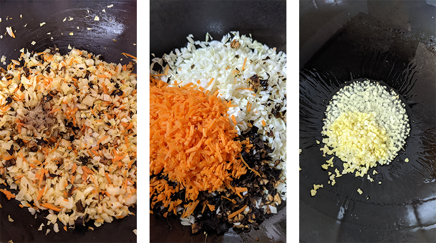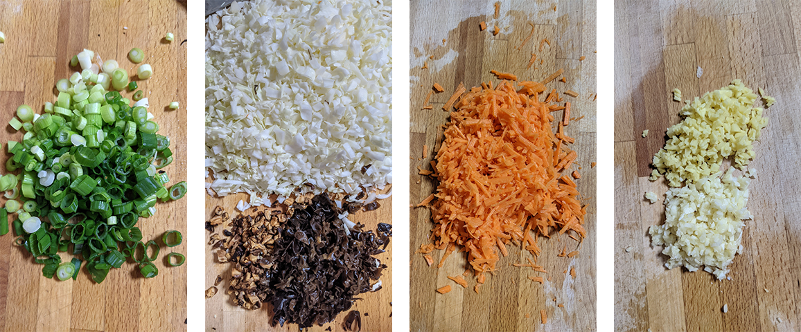 קוצצים דק שום וג'ינג'ר ומניחים בצד. קוצצים לקוביות קטנות גזר וכרוב ומעבירים לקערה. סוחטים את הפטריות ממיי ההשרייה וקוצצים גם אותן לקוביות קטנות, מעבירים לקערה עם הכרוב והגזר. קוצצים בצל ירוק ושמים בקערית נפרדת.